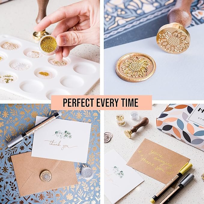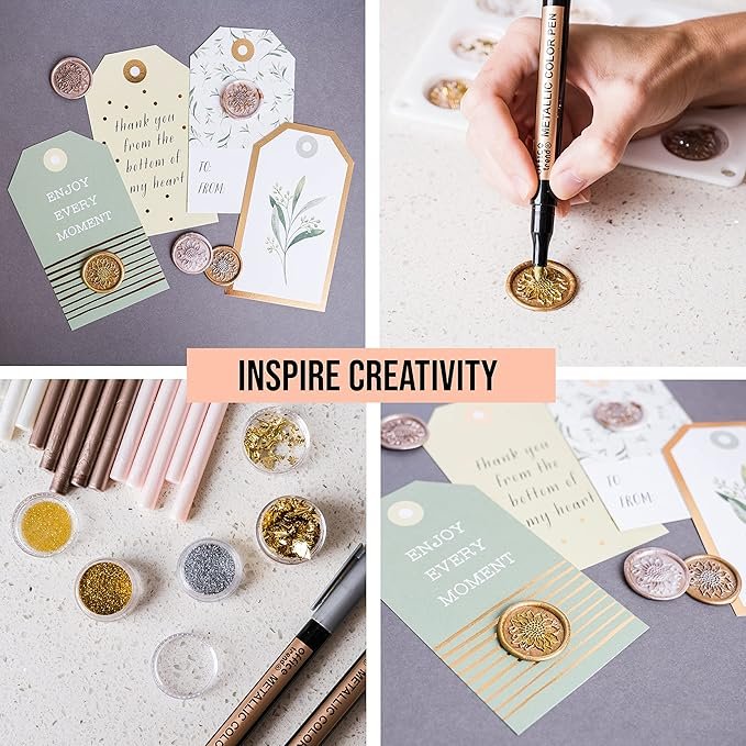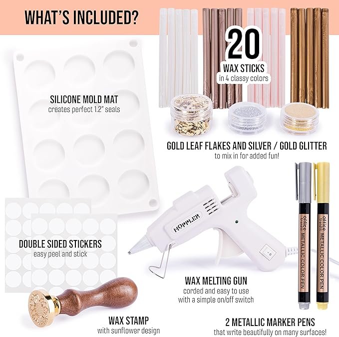 - [All in One Wax Seal Stamp Kit] This sealing wax kit has all the equipment needed to make wax seals for a variety of projects – 1 Sealing gun, 4 colors wax sticks, 1 wax stamp, 2 metallic markers, gold flakes, glitter dust, 50 wax seal stickers, and 1 wax sealing silicone mold.